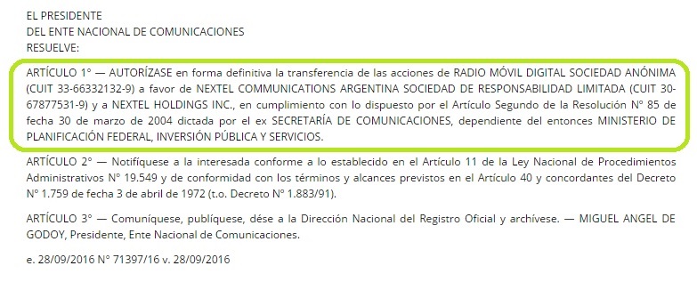 Unos días más tarde, el 9 de enero, el Ente Nacional de Comunicaciones informa a través del Boletín Oficial la Resolución 111 – E/2017, con la firma del amigo de Macri Miguel Ángel de Godoy (aquel al que el periodista Roberto Navarro acusó de apretar a C5N para que lo saquen del aire) por el cual se autorizó “las transferencias accionarias directas e indirectas que se denuncian y que involucran a las firmas TRIXCO S.A., CALLBI S.A., INFOTEL S.A., SKYONLINE DE ARGENTINA S.A., NETIZEN S.A. y ERITOWN CORPORATION ARGENTINA S.A, a favor de la Empresa NEXTEL