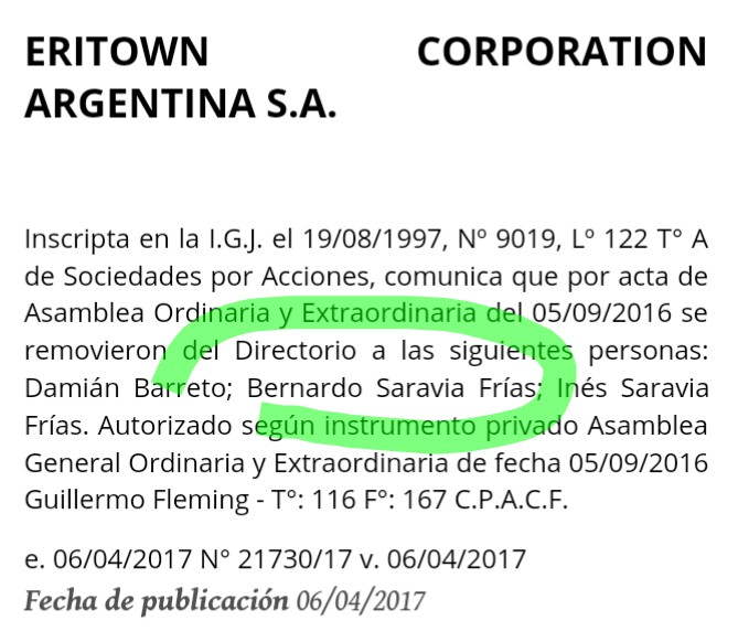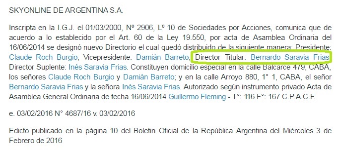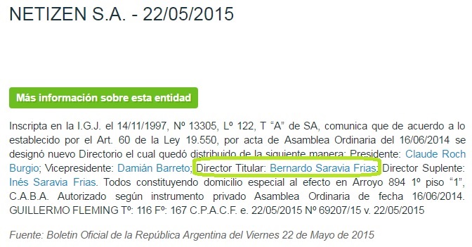 Lo que nadie dijo es que en al menos tres de ellas, las mencionadas Skyonline de Argentina S.A., Netizen S.A. y Eritown era Director el mismísimo Bernardo Saravia Frías.