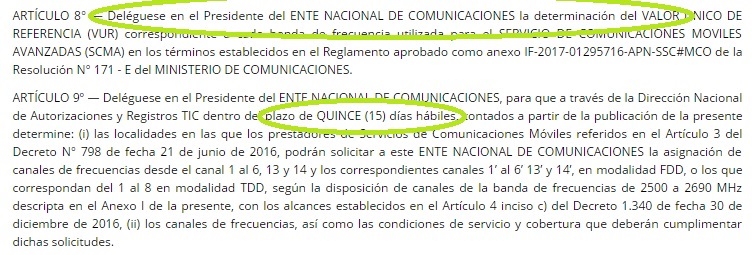 Este plazo de 15 días se vuelve a plantear en el Artículo 13 de la Resolución 1299 – E/2017, publicada el 7 de marzo (que oficializó finalmente la decisión para que el Grupo Clarín ofrezca servicios de telefonía móvil a través de Nextel) que dice: “Delégase en el Presidente del ENACOM las facultades para suscribir, dentro del plazo de QUINCE (15) días hábiles de publicada la presente, el contrato que precise los términos, condiciones, metas, obligaciones y demás cuestiones inherentes a la prestación del Servicio de SCMA que por la presente se autoriza, a los que deberá sujetarse la empresa NEXTEL, conforme los lineamientos particulares aquí establecidos”.