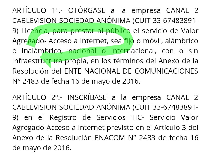 Y para que la gente de Clarín pueda competir en el mercado con las mejores condiciones ante sus «rivales», el 10 de abril se publica en el Boletín Oficial otra resolución del ENACOM, la N° 2122, a través de la cual el Estado le otorga licencia a Canal 2 Cablevisión para prestar al público el servicio de Valor Agregado de acceso a Internet.