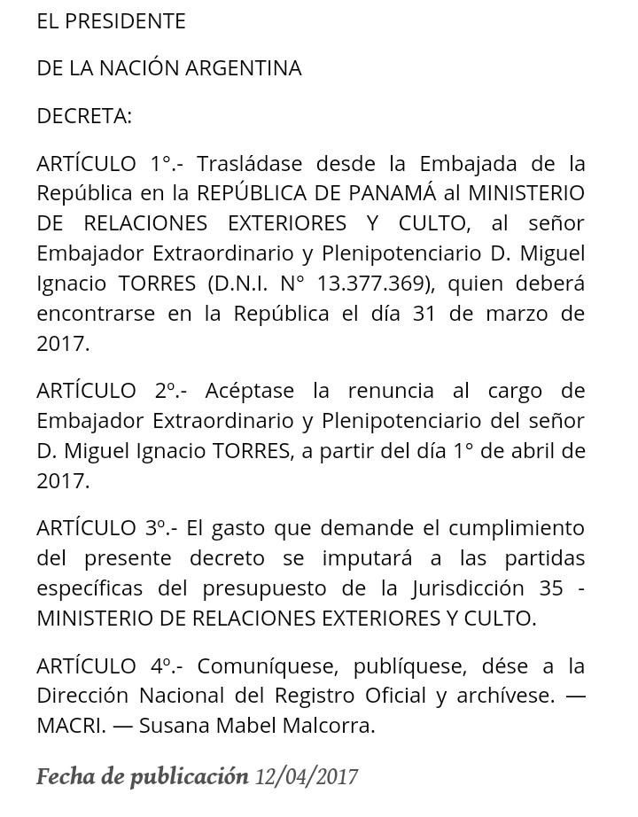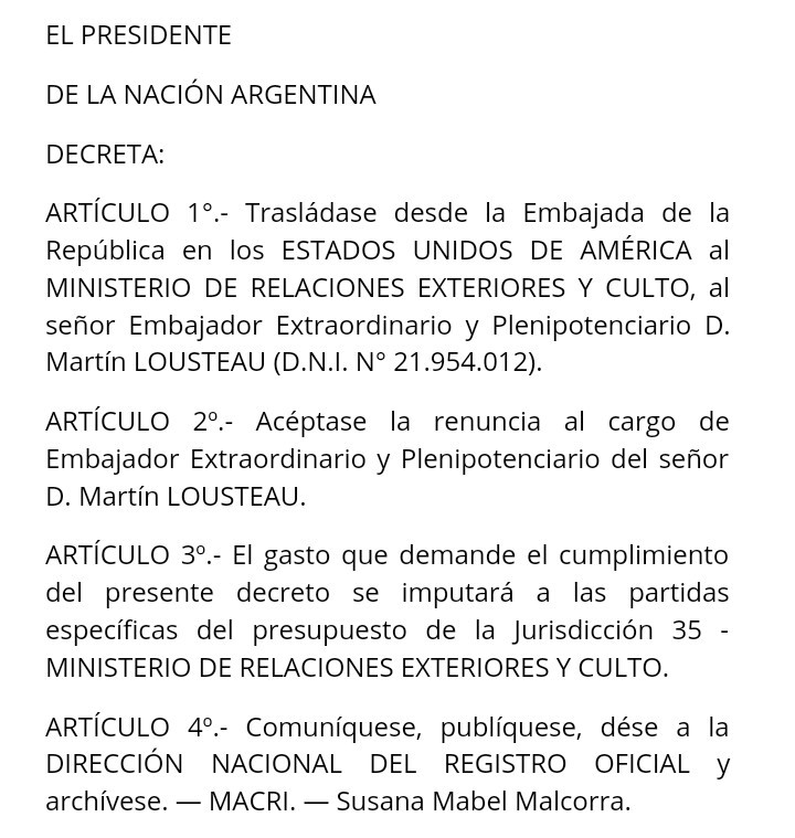 A través de los Decretos 249 y 253, firmados por el Presidente Macri y Susana Malcorra, se dieron a conocer hoy en el Boletín Oficial las renuncias de Martín Lousteau y Miguel del Sel.