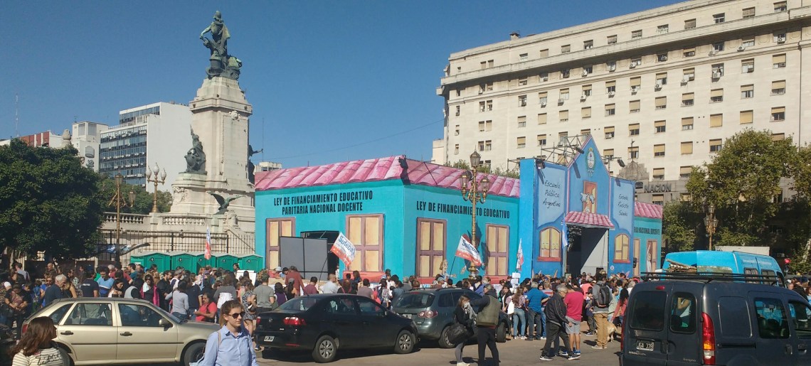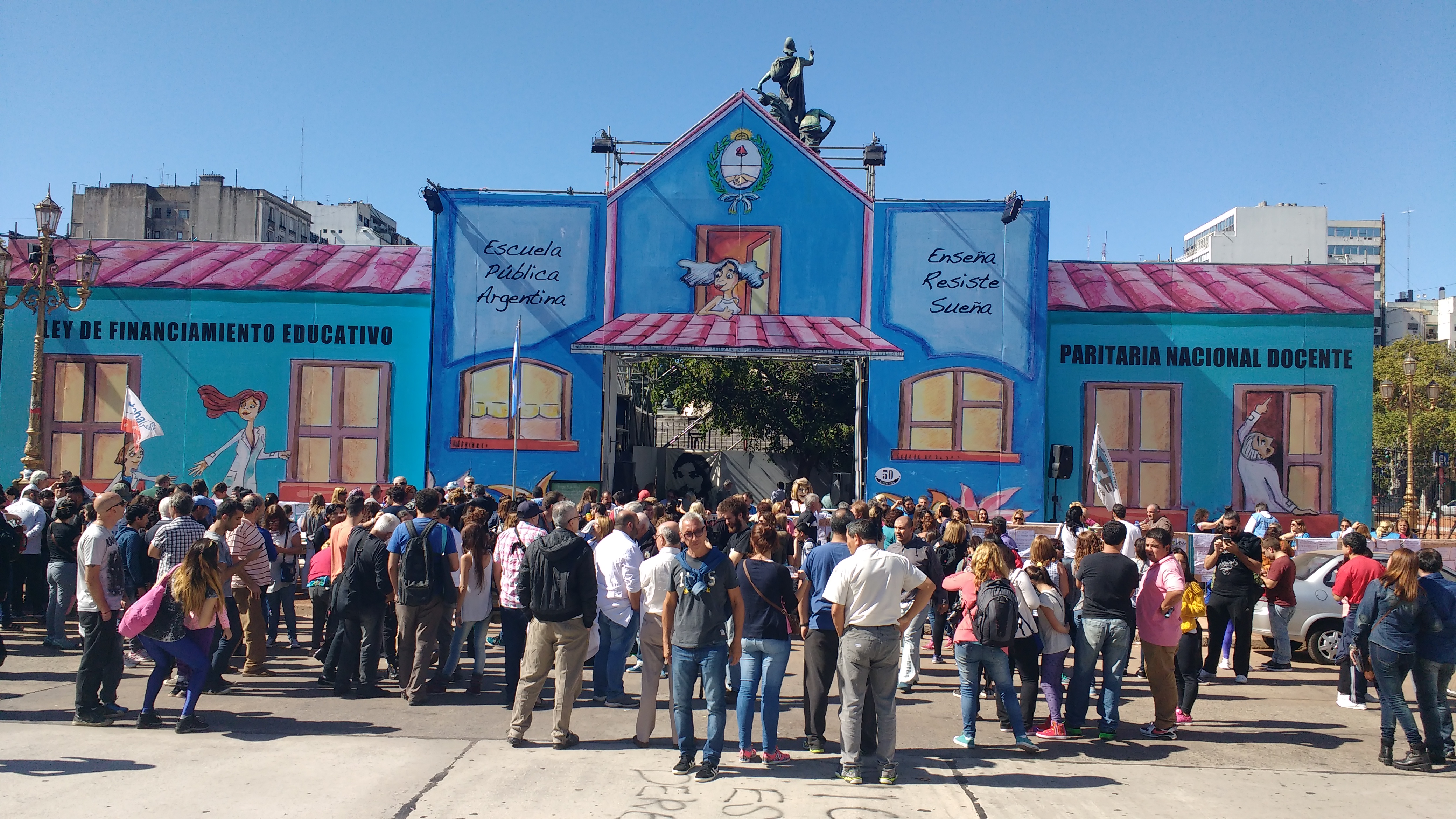 El inmenso edificio celeste es la Escuela Itinerante, y los hombres y mujeres de blanco son, sencillamente, docentes. Allí están desde hace un par de días, visibilizando un reclamo. Las consignas son dos: “Paritaria Nacional Docente” y “Ley de Financiamiento Educativo”. El lema, tres palabras que parecen sintetizarlo todo: “Enseña, Resiste, Sueña”.