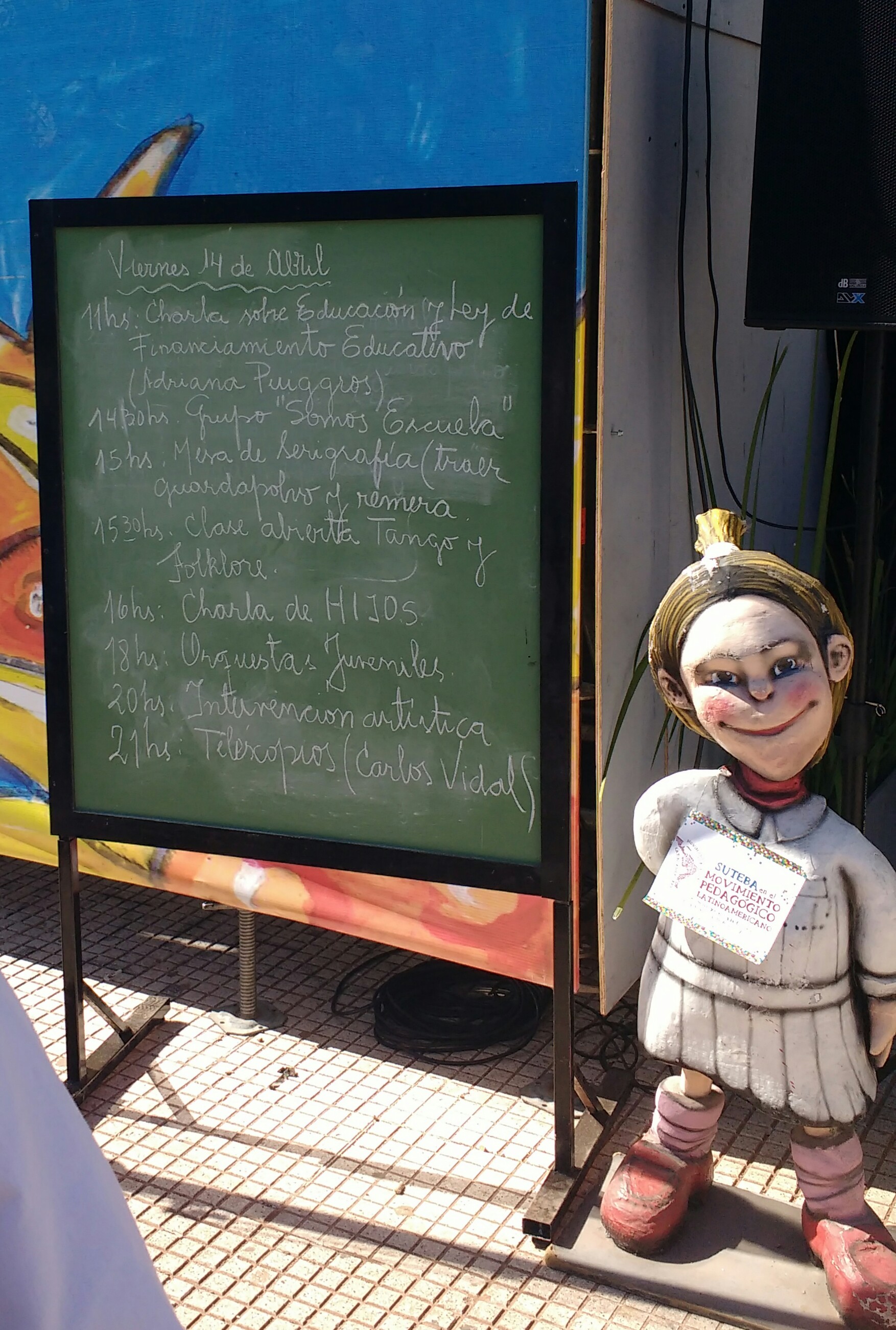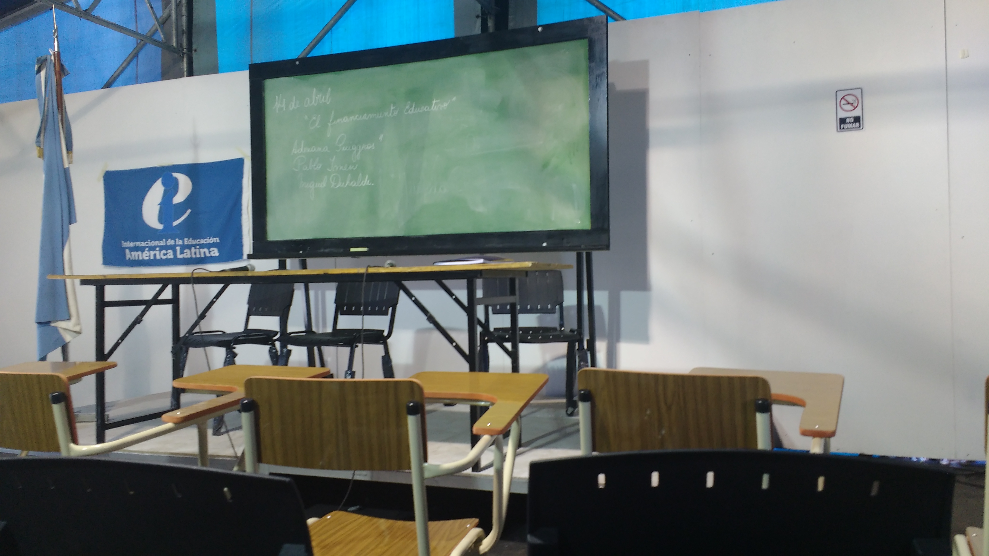 Ingresan. Hay un patio y un aula. En el pizarrón todavía están garabateados los nombres de Adriana Puiggros, Pablo Imen y Miguel Duhalde, quienes el día anterior debatieron sobre el financiamiento educativo. El pequeño del rulo caprichoso se sienta en un banco con pupitre mientras su madre recorre con un vistazo las imágenes de lucha que revisten las paredes. Encoge un poco sus hombros, como no queriendo aceptar que nuevamente la Escuela Pública esté allí, otra vez menospreciada desde el gobierno, ensuciada…