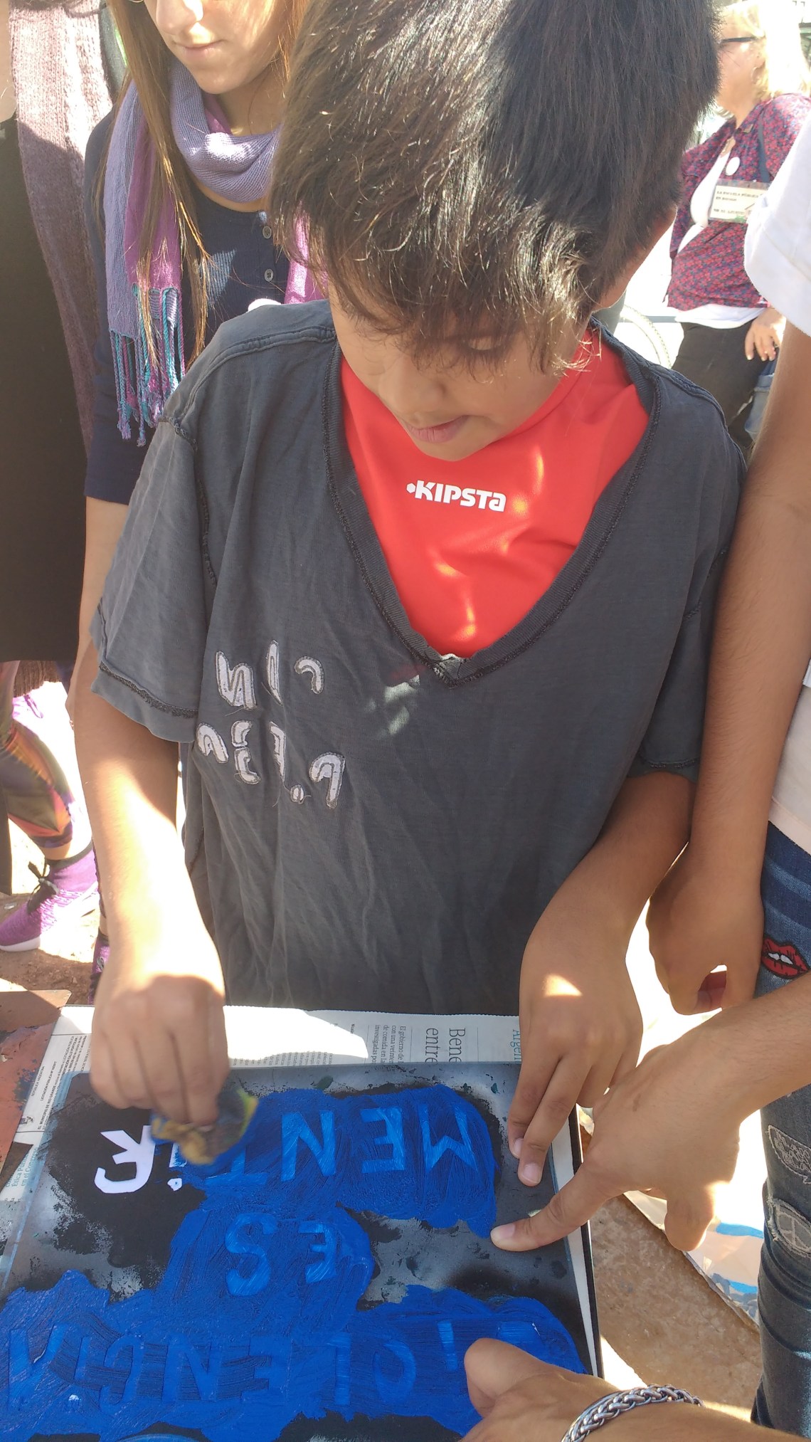 Shablón en mano los docentes les explican cómo estampar los diseños. Al lado, vaya uno a saber cómo, en una silla, el niño del rulo ha conseguido un lugar. Con una esponjita repleta de tinta repasa, ante la atenta mirada de su madre, las letras recortadas de un acrílico que conforman una frase que el pequeño quiso estampar en su delantal: “Violencia es mentir”.