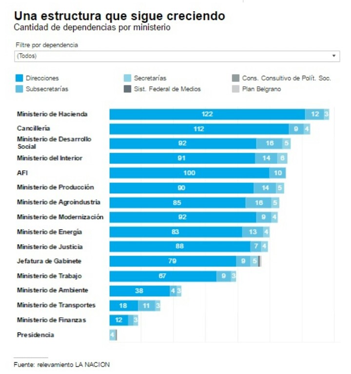 El aumento de ministerios y la creación casi ilimitada de estructuras administrativas en el gobierno deMauricio Macri se pueden observar en la pagina web del Ministerio de Modernización, que dirige Andrés Ibarra, Mapa del Estado. Cada cargo es un casillero del organigrama, que en la jerga estatal es un «raviol». La «fábrica de ravioles» funciona a pleno.