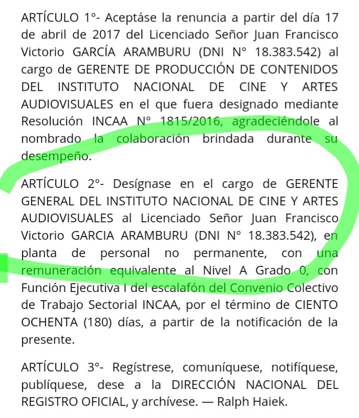 Se publicó hoy en el Boletín Oficial la Resolución 937/17 del INCAA que anuncia el nombramiento de Juan García Aramburu como flamante Gerente General del INCAA.