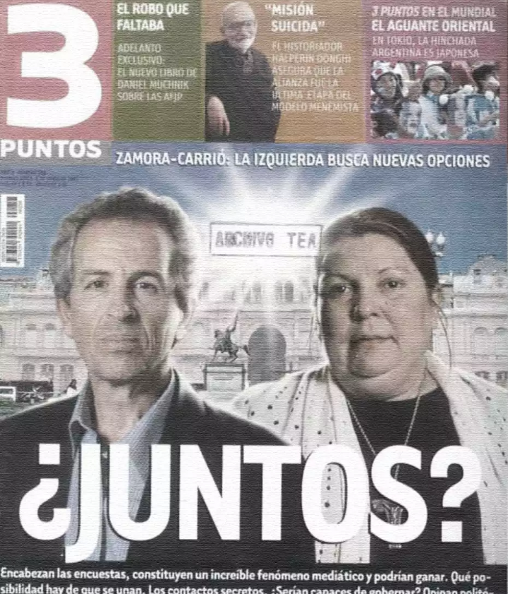 Casi nadie recuerda que alguna vez Zamora, Elisa Carrió y Víctor De Gennaro ensayaron una alianza política que incluso, no sin wishful thinking progresista, fue tapa de la Revista Tres Puntos. Poco después Carrió justificaba su alejamiento: “Estar cerca de Zamora me hizo perder inserción sobre todo en las ciudades y pueblos de las provincias. Tuvimos mucho costo”. Aquellas conversaciones solo fueron posibles por el clima de crisis y de búsquedas post-2001.