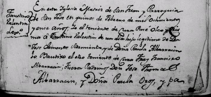 Como se ve, dice allí que “En esta Iglesia Matriz de San Juan y Parroquia de San Jose un quince de Febrero de mil ochocientos y onse años; Io el teniente de cura puse Oleo y Crisma a Faustino Valentin de un dia hijo legitimo de Don Jose Clemente Sarmiento y de Doña Paula Albarracin”.