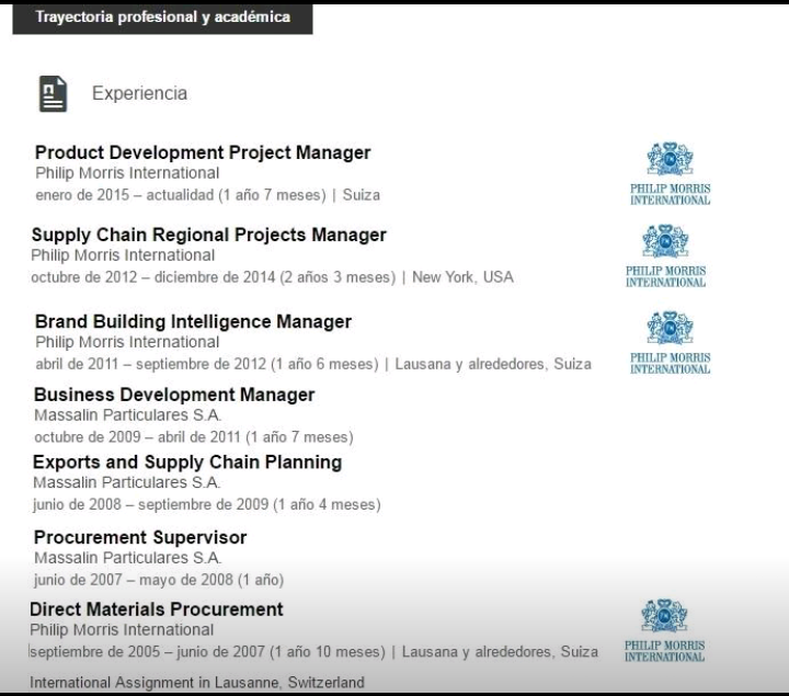Es más, Nuestras Voces nos brinda un pormenorizado currículum del Ingeniero en cuestión donde se ve, claramente, que su último trabajo antes de acceder al Ministerio de Educación había sido como Product Development Project Manager en la sede Suiza de Philip Morris y, según se ve por el tiempo especificado por él mismo en la función, la ejerció hasta julio de dicho año 2016 (justo cuando es nombrado Subsecretario de Gestión y Políticas Socioeducativas.