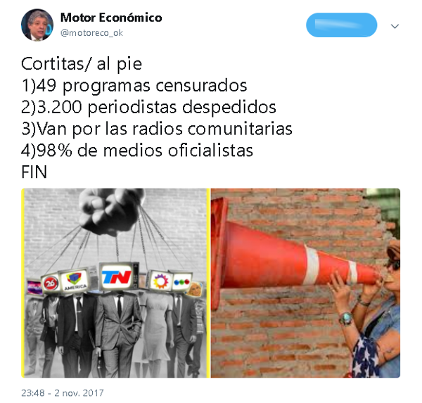 Los riesgos que el modelo retrógrado de Cambiemos implica difícilmente lleguen con crudeza a oídos de los que, con el voto, pagaron para ver. Tampoco la reivindicación de logros forjados en tiempos idos a favor del patrimonio nacional y la construcción de una vida democrática. La síntesis que realiza el periodista Raúl Dellatorre sepulta cualquier esperanza al respecto: “49 programas censurados, 3.200 periodistas despedidos, van por las radios comunitarias, 98% de medios oficialistas”.