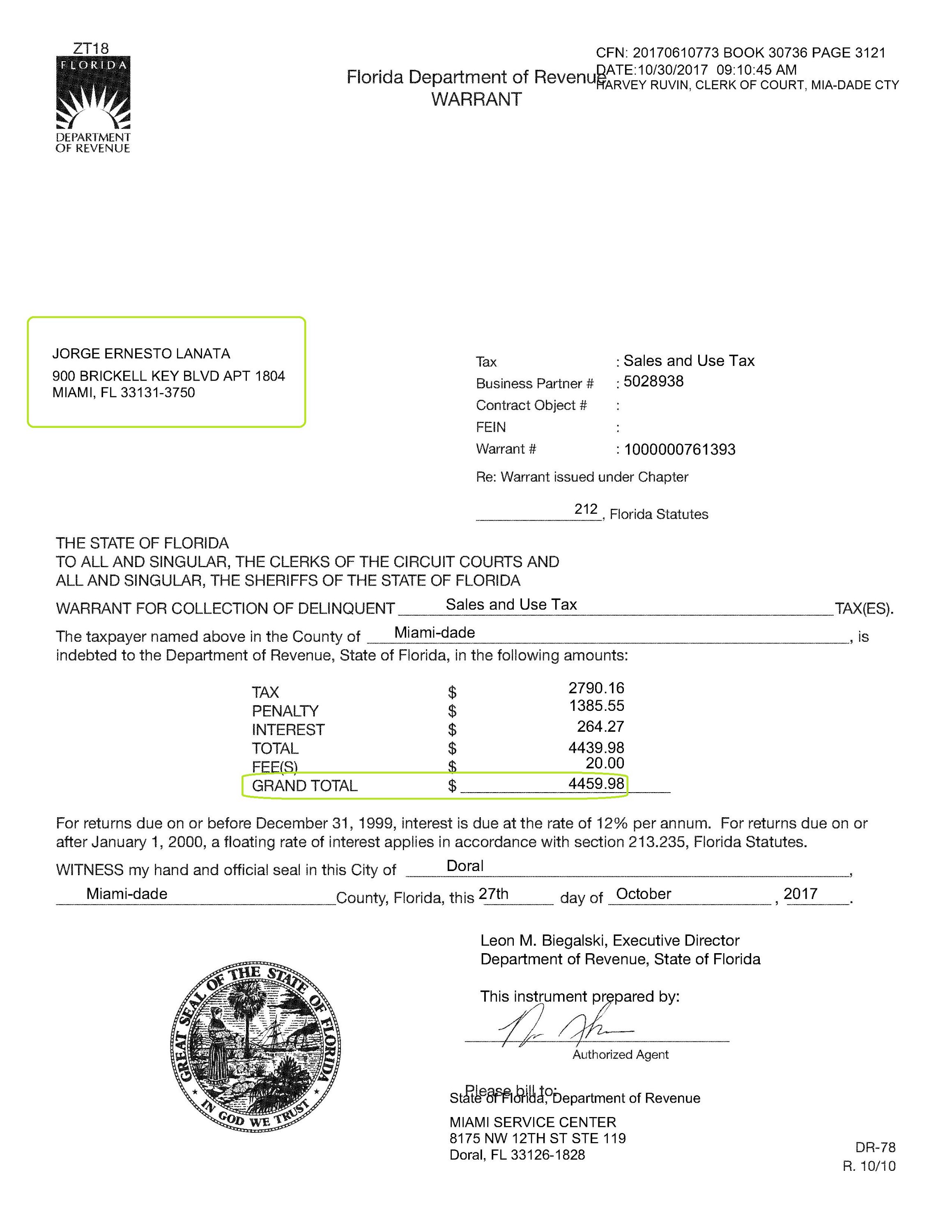 Pero se ve que el periodista no está en condiciones de afrontar tanto lujo o ha sido protagonista de un “descuido”, pues el 30 de octubre pasado el Departamento de Ingresos del Estado de Florida del país del Norte al que tanto suele frecuentar, intimó al contribuyente Jorge Ernesto Lanata por una deuda impositiva con dicha entidad que ya ronda los u$s 4.500.-