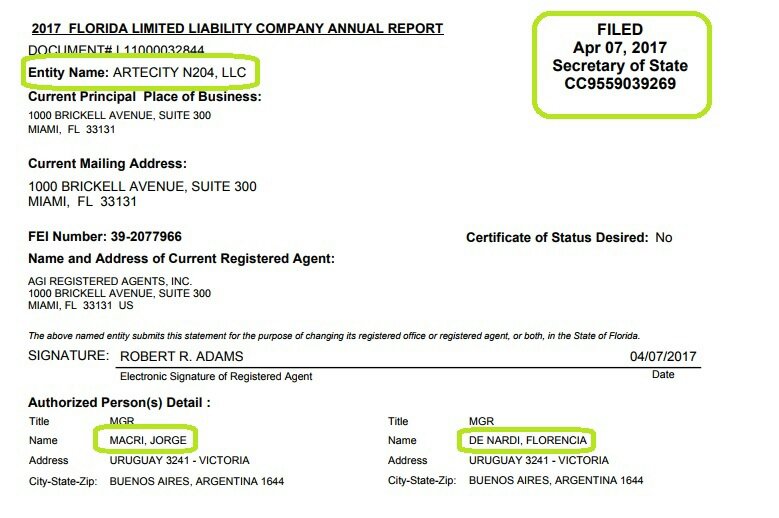 Artecity N204 LLC, la Offshore de Jorge Macri y Florencia de Nardi continúa siendo una empresa activa. Prueba irrefutable de ello es el documento que presentamos a continuación donde consta la presentación de la DDJJ anual de la compañía, presentada el 7 de abril de este año, donde ambos socios figuran como titulares.
