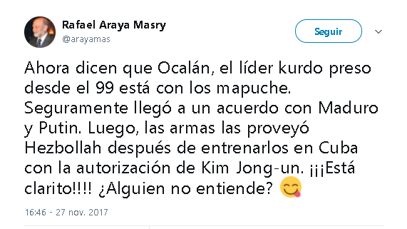 Puesto frente a las imposturas propias de una competencia despiadada entre la obsecuencia, las operaciones digitadas y la venalidad periodísticas, Rafael Araya Masry, corresponsal de Radio y Diario Universidad de Chile, entre el asombro y la risueña indignación, escribe: «Ahora dicen que Ocalán, el líder kurdo preso desde el 99, está con los mapuche.». Una muestra en el océano de botones. Pero la dosis masiva de grotesco no borra dolores ni exorciza el peligro de históricas reincidencias. Tampoco la distancia de casi dos años entre el garrote y el plomo desarticulará necesariamente mayores tragedias en ciernes.