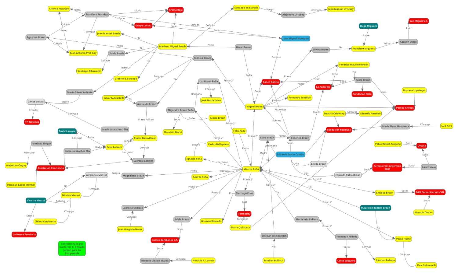 A modo de intentar explicarlo gráficamente, construí una sección acotada de dicha Red a modo de que se visualicen las relaciones a las que hago mención. Destaco lo de “acotada” pues es muy sencillo seguir agregando nombres y relaciones a los que se encuentran allí pero esto entorpecería, por su magnitud, la visualización.