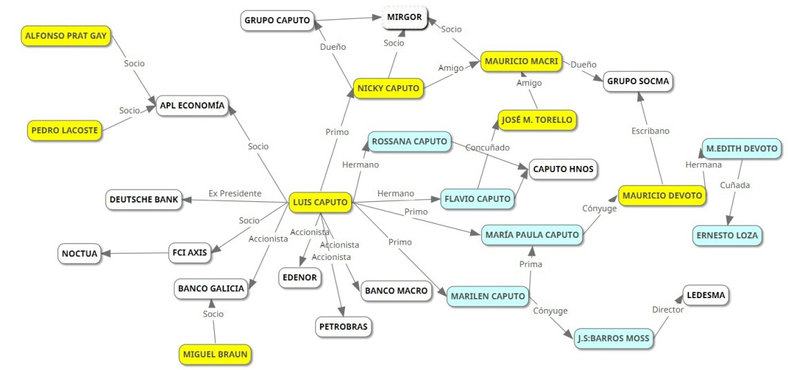 Luis Caputo es primo de María Paula Caputo, quien se casó con Mauricio Devoto, el Secretario de Planificación Estratégica del ministerio de Justicia y Derechos Humanos y que en esta entrelazada red, supo ser Escribano del Grupo SOCMA (o sea, el Escribano de Macri).