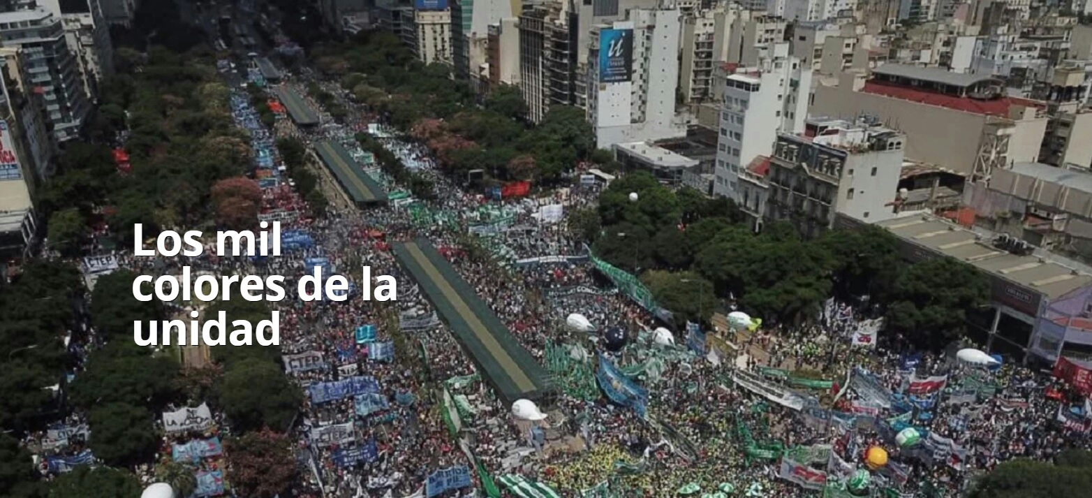 Se escuchó. Y ahora era Pablo, varón de Camioneros, co-conductor del escenario. “Seguro que los medios no van a decir todo esto”, retomó Estela. “Pero no importa”, dijo. “Acá tenemos la presencia de miles de trabajadores, miles de trabajadoras, miles de dirigentes”. Y dijo: “En la avenida mas ancha del mundo, la unidad de los trabajadores”. Y él: “Porque no queremos que los ricos sean ricos a costillas de los trabajadores”. Y ella: “Acá no hay divisiones: el pueblo salió a gritar unido. ¡Que flameen las banderas, y si lo medios quieren invisibilizarnos, usemos las redes, usemos Facebook, usemos Instagram!”