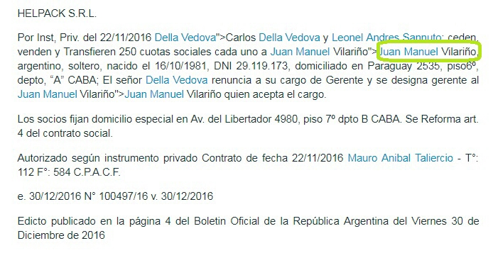 La firma HELPACK S.R.L. se constituye el 26 de marzo de 2015, publicándose el 1º de abril de dicho año en el Boletín Oficial. Su socios son : Carlos Della Vedova y Leonel Andrés Sannuto. Entre sus actividades se destaca la del punto “b”: “El alquiler de maquinarias, vehículos, grúas, generadores y demás utilitarios destinados a la construcción y obras de arquitectura e ingeniería civil con y sin operarios”. Y pese a que Della Vedova lo desmiente en su solicitada, el capital original constitutivo fue de escasos $20.000.-