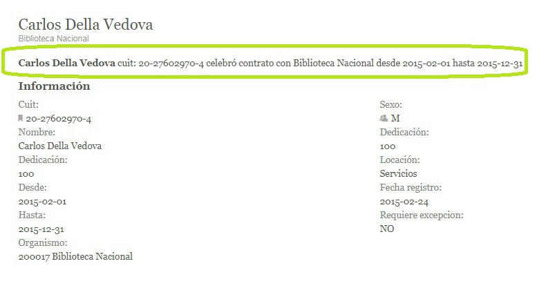 En realidad esta declaración puede tomarse como una verdad a medias, pues si bien Della Vedova había dejado de ser personal contratado del Gobierno de la Ciudad, renunciando, como él mismo expresa, el 1º de febrero de 2015, inmediatamente pasó a ser contratado por el Ministerio de Cultura de la Nación, desempeñando funciones allí durante todo el 2015 en la Biblioteca Nacional. O sea, si bien, al constituirse HELPACK no era personal contratado del Gobierno de la Ciudad, si lo era del Gobierno Nacional.