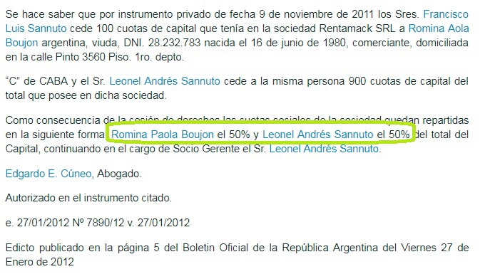 Como dijimos renglones más arriba Sannuto era socio de otras empresas. En una de ellas, la mencionada RENTAMACK S.R.L., comparte capital 50 y 50 con una tal Romina Paola Boujon. La sociedad se constituyó en 2011 y su objeto social era prácticamente idéntico al de HELPACK.