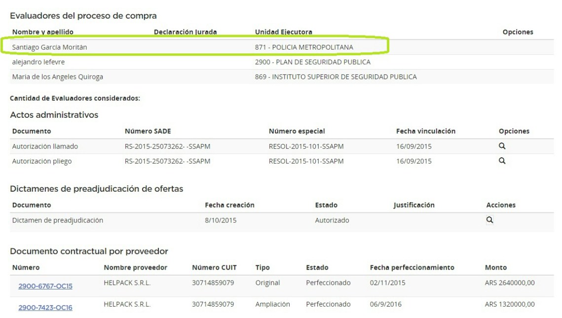 Y como vemos, no es la única, pues también se encontraba, por ejemplo, el Director de Logística y Distribución de Seguridad Santiago García Moritan, que si nos fijamos bien, es el evaluador del proceso de compra en representación de la Policía Metropolitana en la licitación que obtuvo HELPACK.