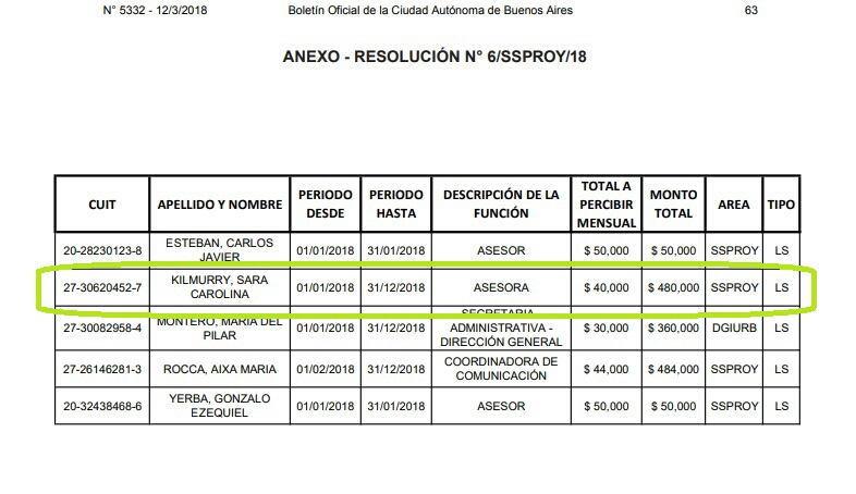 En dicho anexo se especifica la contratación de Sara Carolina Kilmurry, como Asesora de la propia Subsecretaría de Proyectos que comanda su cuñado, con una retribución mensual de $40.000.-