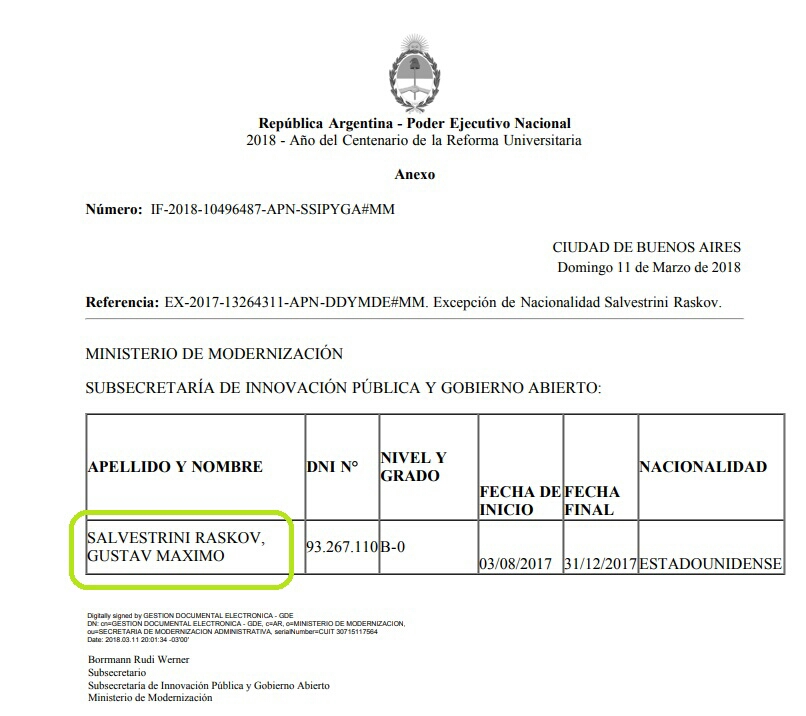 Se publicó en el Boletín Oficial de la fecha la Decisión Administrativa 336/2018 del Ministerio de Modernización por la cual se autoriza la contratación del ciudadano estadounidense Gustav Máximo Salvestrini Raskov “con carácter de excepción al requisito de nacionalidad para el ingreso a la ADMINISTRACIÓN PÚBLICA NACIONAL, establecido en el artículo 4° inciso a), del Anexo a la Ley Marco de Regulación de Empleo Público Nacional N.º 25.164”