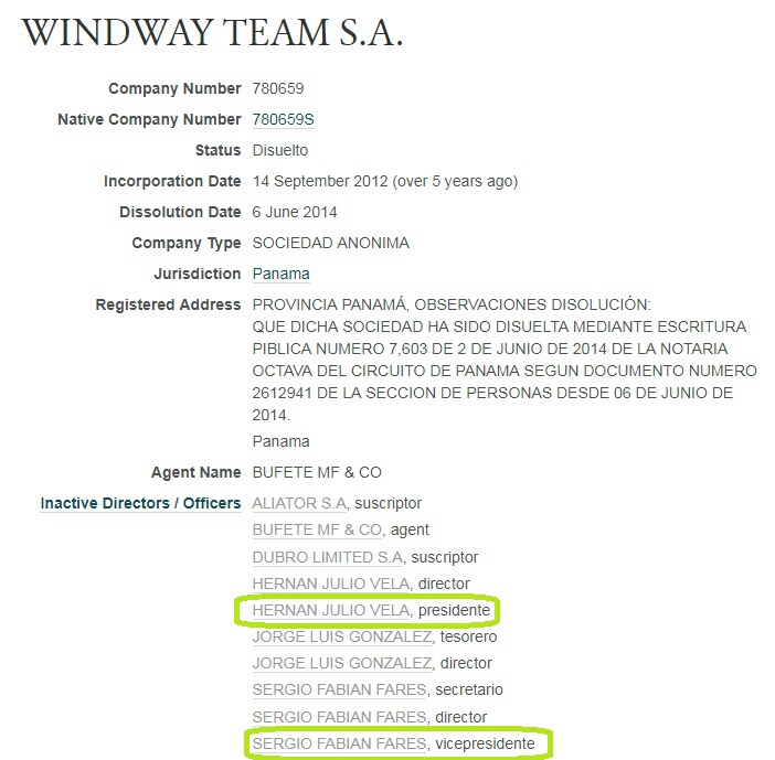 Ambos, también, figuran como Directores de WINDWAY TEAM S.A., firma radicada en Panamá y que operó entre 2012 y 2014. El ex funcionario era su Presidente y Fares el Vice.