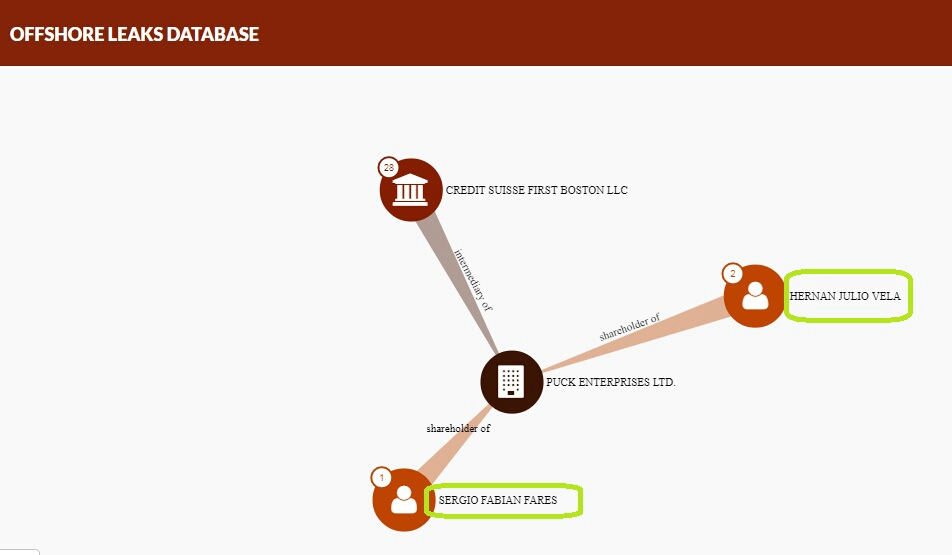 Retomando las relaciones de los socios investigados y los funcionarios, no ha salido a la luz todavía el “entramado offshore” de los partícipes, el cual debería ser investigado en la Justicia. Entre los principales hallazgos de empresas en el extranjero de los mismos se destaca, por ejemplo, que Fares y Vela son socios en PUCK ENTERPRISES LTD, una empresa Offshore activa fundada en 2012 con registro en las Islas Vírgenes, domicilio en Miami y con operaciones en Suiza.