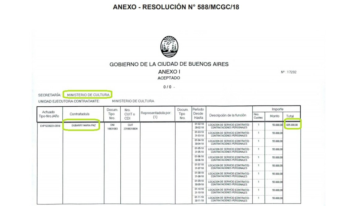 Como se ve, Paz Dubarry es una persona afortunada que puede afrontar una vida de lujo y placer. Y eso es, en parte, seguramente, gracias a los más de 600.000 pesos que cobró en 2017 por “prestar servicios para la Dirección General Técnica, Administrativa y Legal de este Ministerio de Cultura” de la Ciudad de Buenos Aires, como afirma la RESOLUCIÓN N.º 588/MCGC/18 firmada el 27 de febrero de 2018 por el Ministro Enrique Avogadro.