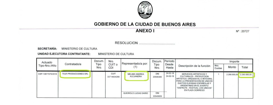 A esto se suma hoy la RESOLUCIÓN N.° 1711/MCGC/18 firmada por el Ministro de Cultura Enrique Avogadro que, en el marco del evento «DISFRUTE – FESTIVAL UNICOS», realizado en las locaciones de Plaza Dorrego y Plaza Vaticano de la Ciudad Autónoma de Buenos Aires, le otorga a TAJA PRODUCCIOONES, representada por Andrea Melnik, 2.290.000 pesos por la produccón de servicios artísticos y culturales y 450.000 más por la RESOLUCIÓN N.° 1715/MCGC/18.