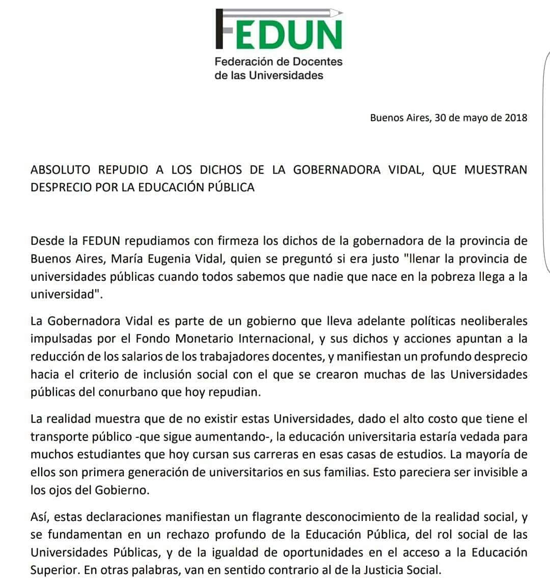 La Federación de Docentes de las Universidades emitió un comunicado ante los polémicos dichos de la Gobernadora María Eugenia Vidal.