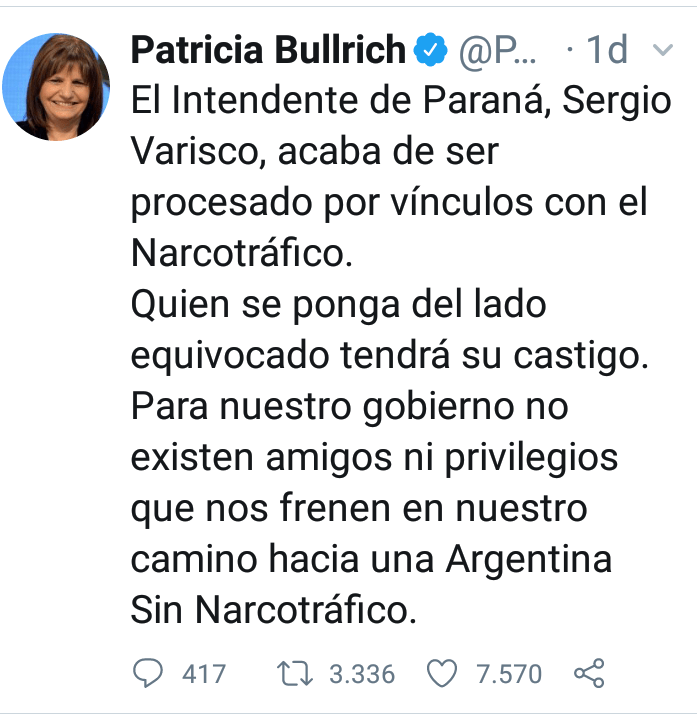 Mientras tanto, una desesperada Patricia Bullrich tuitea que para el “gobierno no existen amigos ni privilegios” intentando despegarse de un Varisco con el que, hasta hace unos meses, no dejaba de sacarse fotos junto a su equipo como paladines de la lucha contra los narcos.