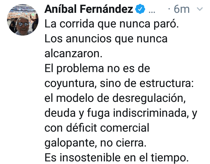 “La corrida que nunca paró. Los anuncios que nunca alcanzaron. El problema no es de coyuntura, sino de estructura”, tuiteaba hace unos minutos el ex Jefe de Gabinete Aníbal Fernández, previo al cierre de una nueva y agitada jornada cambiaria, que le puso broche de oro a un mes de marcada tendencia alcista del dólar.