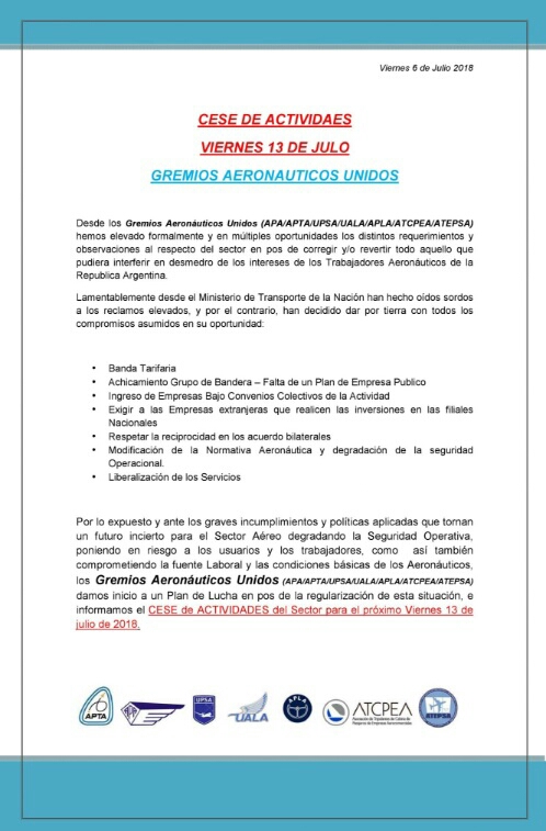 Los Gremios Aeronáuticos Unidos APA-APTA-UPSA-APLA-ATCPEA-UALA-ATEPSA, inician un plan de lucha en protesta a la política aerocomercial impulsada por el Gobierno el próximo viernes 13 de julio de 2018.
