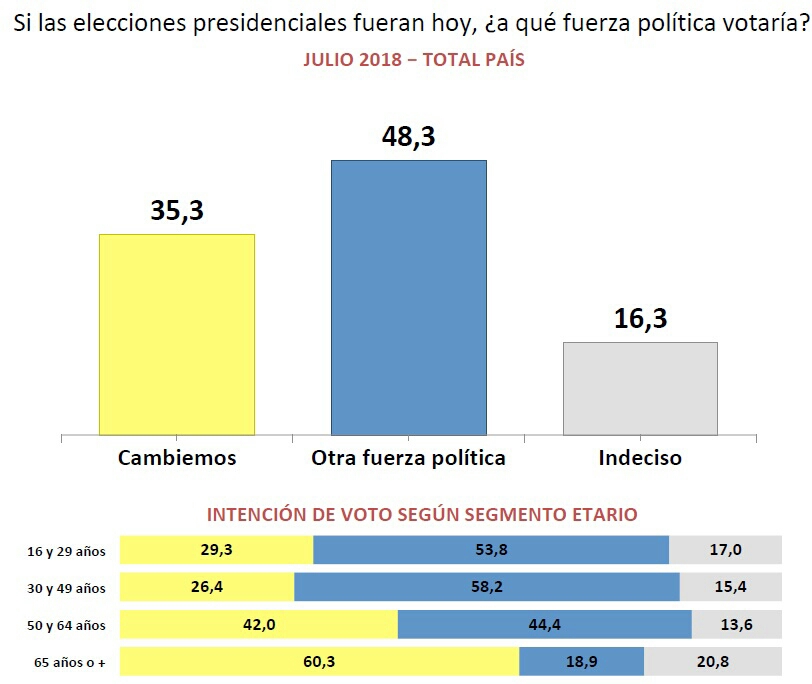 En el otro extremo, en los menores de 50 años, dicho porcentaje se reduce a más de la mitad, no llegando a 3 de cada 10 argentinos los que votarían al actual partido gobernante.