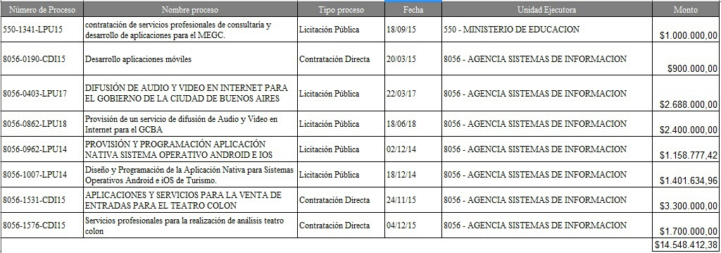 El contrato más jugoso lo obtuvo a través de una contratación directa por “Aplicaciones y Servicios para la venta de entradas para el Teatro Colón” por lo que recibió 3.300.000 pesos.