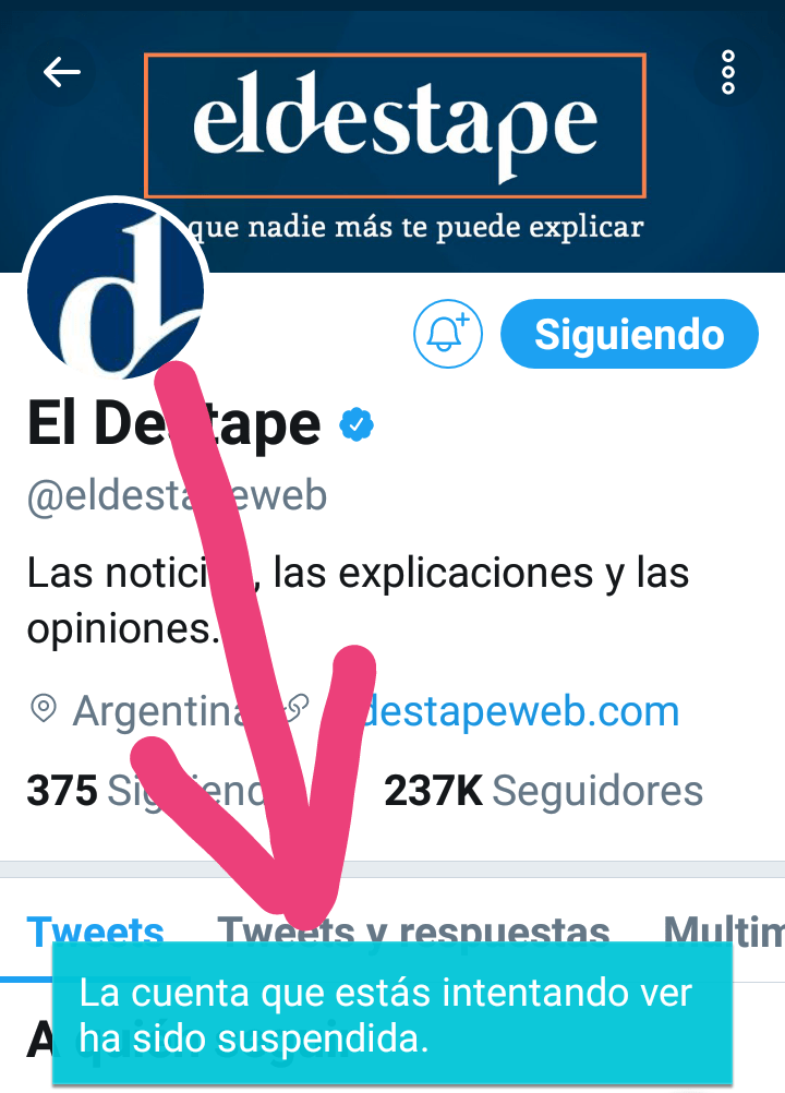Desde hace unos minutos, sin explicación, la cuenta en Twitter de El Destape aparece con un cartel de suspensión. Recordemos que este dicho medio quien viene llevando adelante, a través del periodista Juan Amorín, la reveladora noticia de “aportantes truchos” que envuelve en un escándalo al actual gobierno.