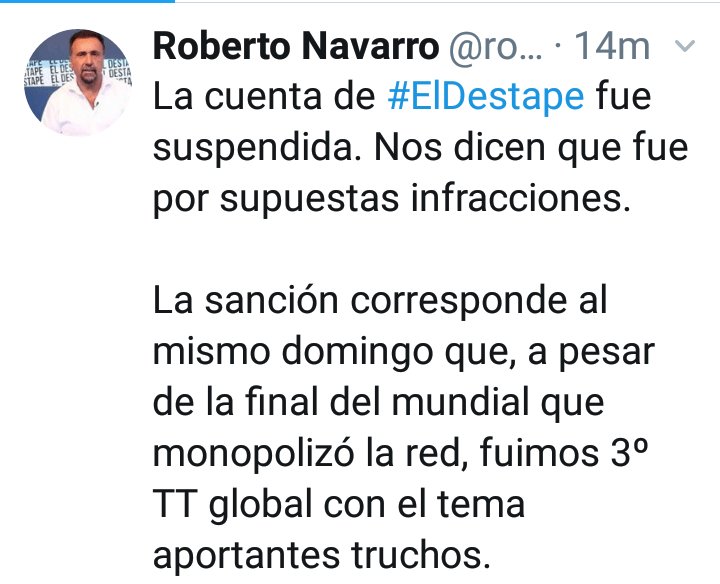 La cuenta de twitter de Roberto Navarro “El Destape” se encuentra suspendida