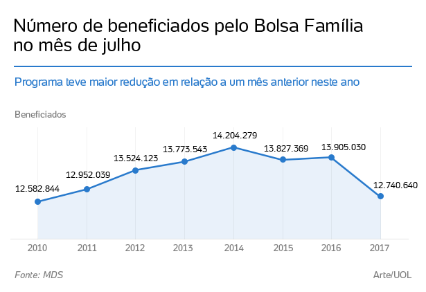 Desde el 2016 cuando se congeló por 20 años gasto, la bolsa de familia sufrió un recorte de R$ 10.MM, de 2.3MM en el 2017 y más de mil millones para el 2018. Recuerde que la Bolsa Familia estamos hablando de estos montos: