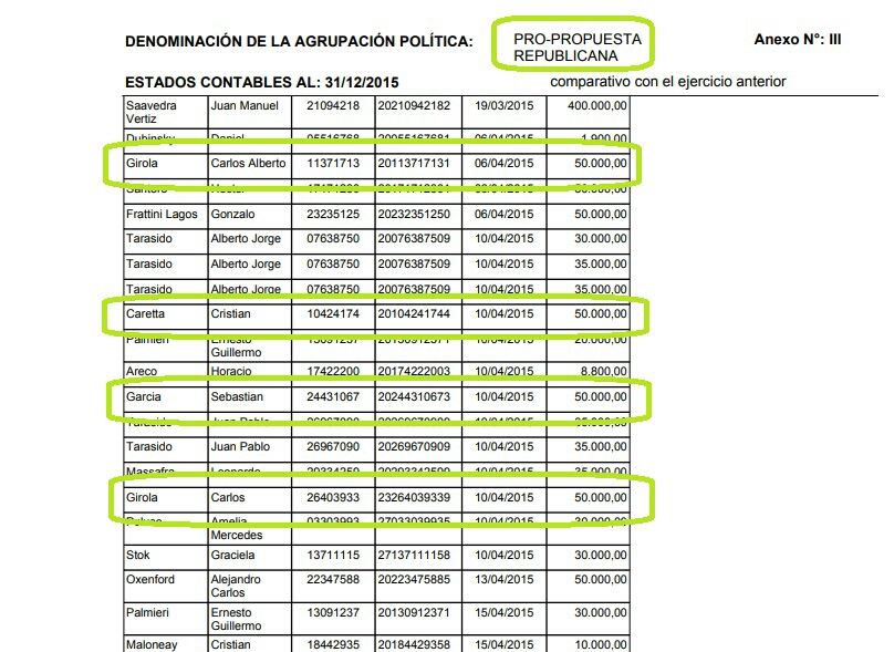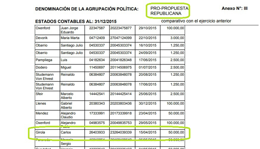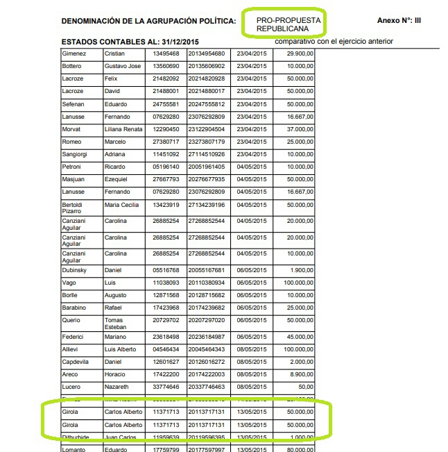 En primicia, te mostramos hoy los documentos que prueban que, para la campaña del 2015, existen innumerables aportes vinculados a este contratista a favor del PRO. Los mismos fueron realizados por Carlos Girola en persona, por parientes, por socios y por empleados; todos en efectivo y cada uno de ellos por exactamente $50.000.-