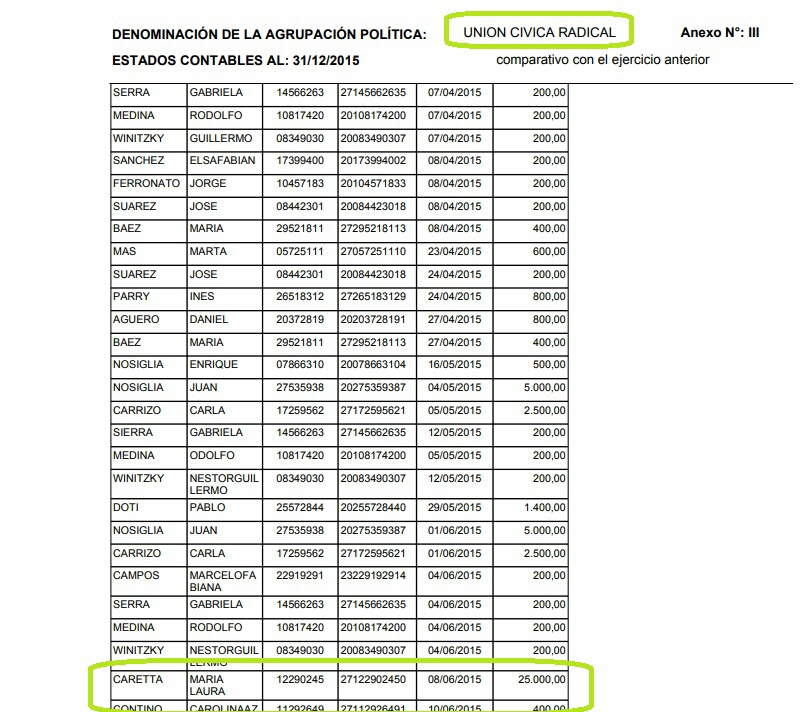Pero esto no es todo. En simultáneo, la esposa de Carlos Girola, María Laura Caretta, realizó al menos un aporte de 25.000 pesos a la Unión Cívica Radical, aliado del PRO en la campaña presidencial y en el actual gobierno.
