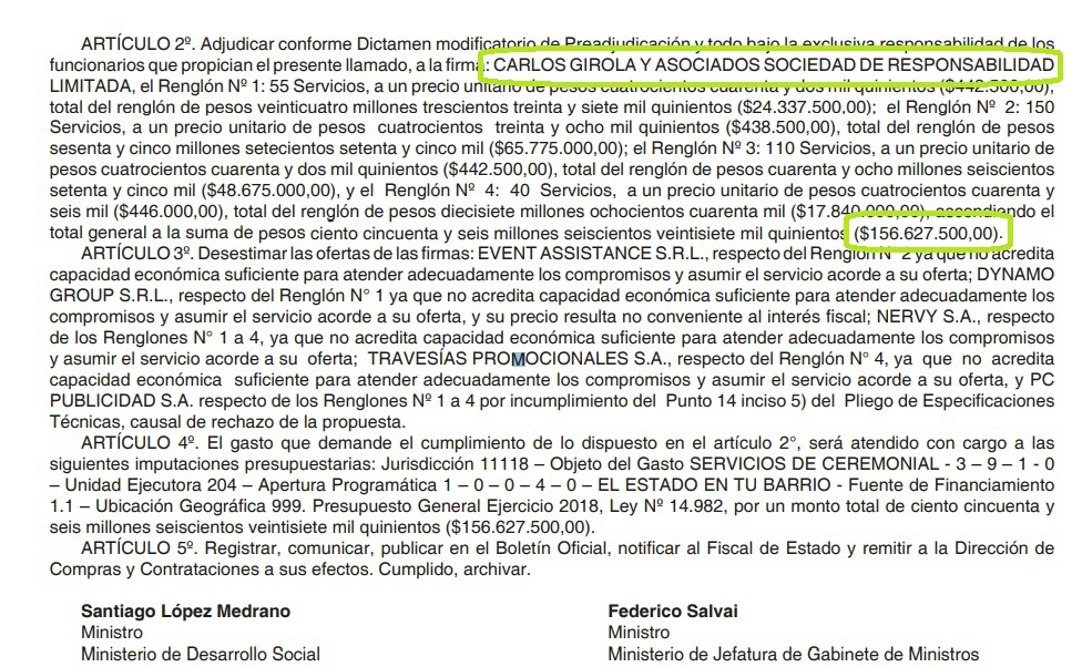 La adjudicación de la contratación del Servicio de Organización de Eventos para el Programa “El Estado en tu Barrio” en la Provincia de Buenos Aires por un plazo de 180 días, fue otorgada a la firma Carlos Girola y Asociados S.R.L., por un monto total de ciento cincuenta y seis millones seiscientos veintisiete mil quinientos pesos ($156.627.500,00).