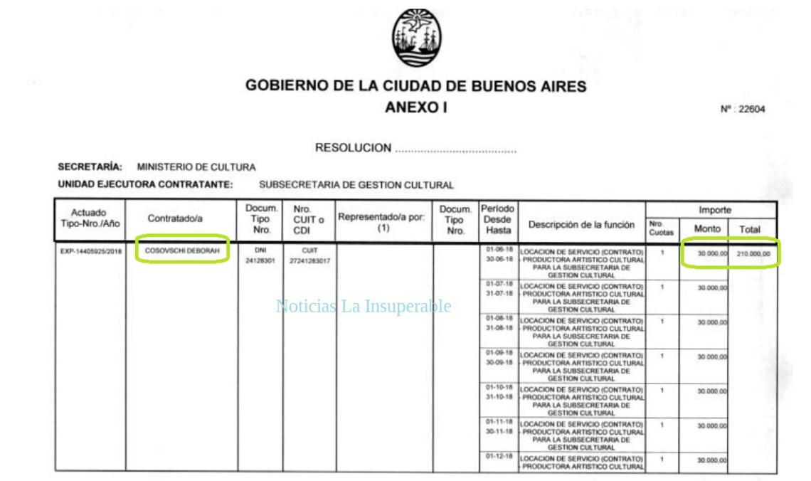 Pero ahora también hemos hallado el documento que certifica que la esposa del actor, la periodista Déborah Cosovschi, no solo es contratista del gobierno de Rodríguez, sino que además también recibe 30.000 pesos al mes por ser Productora Artístico Cultural de la Subsecretaría de Gestión Cultural.