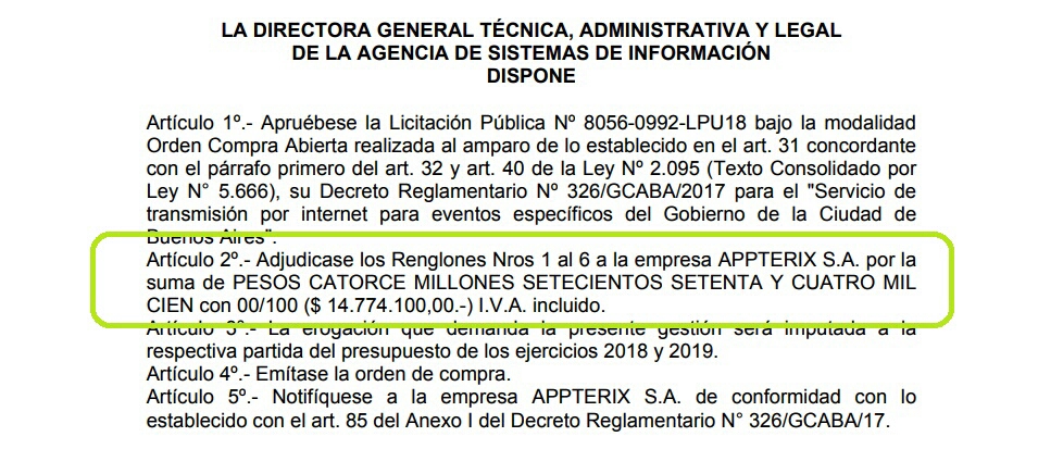 El pasado 4 de julio Brenda Santagada López, Directora General Tecnica, Administrativa y Legal (DGTAL) en Agencia de Sistemas de Información, publicó el llamado a licitación DISPOSICIÓN N.º 265/DGTALINF/18 para el «Servicio de transmisión por internet para eventos específicos del Gobierno de la Ciudad de Buenos Aires» cuyas ofertas debían presentarse el día 10 del mismo mes a las 11 de la mañana (de miércoles para martes y con fin de semana largo en el medio).