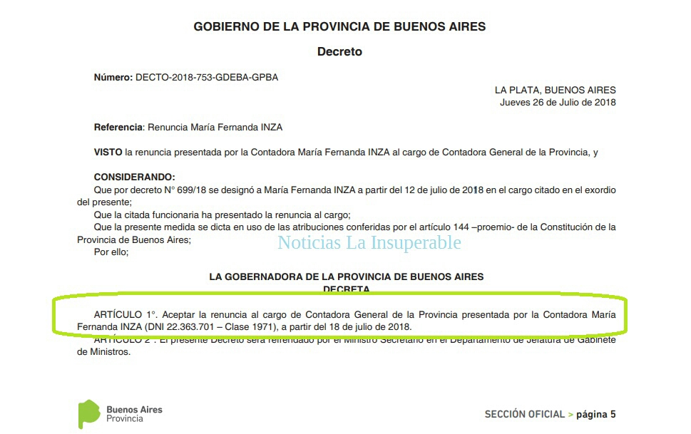 Finalmente hoy, 1º de agosto, se publicó con firma de la gobernadora el DECTO-2018-753-GDEBA-GPBA mediante el cual se acepta “la renuncia al cargo de Contadora General de la Provincia presentada por la Contadora María Fernanda INZA (DNI 22.363.701 – Clase 1971), a partir del 18 de julio de 2018”