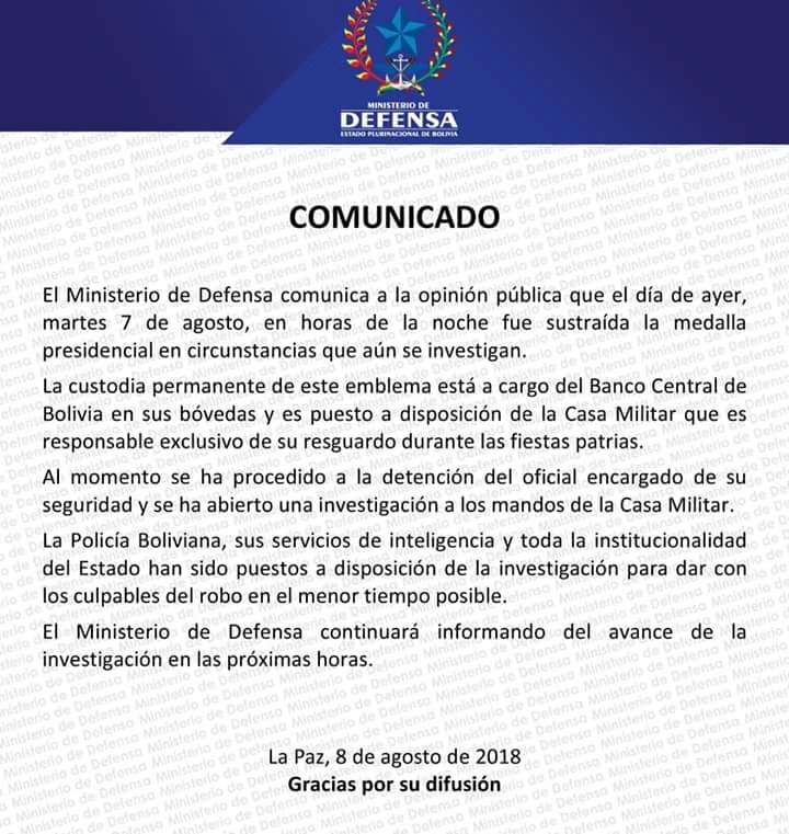 La medalla presidencial de Bolivia fue robada la noche del martes cuando era trasladada desde La Paz hasta Cochabamba, donde iba a ser utilizada por el mandatario Evo Morales, durante la parada militar que se realizaría hoy.