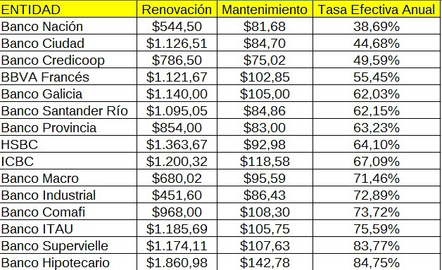 Al panorama actual de necesidad de financiamiento hay que sumarle la gran variedad de tasas que brinda hoy el mercado, virtud de un gobierno que no regula ni aplica controles. Dentro de los bancos de primera línea, hay algunos cuya Tasa Efectiva Anual (la famosa TEA sobre la que se calcula tu financiación) duplica a la de otros. Las mismas, hoy día, oscilan aproximadamente entre el 38 y el 85% (mucha diferencia)