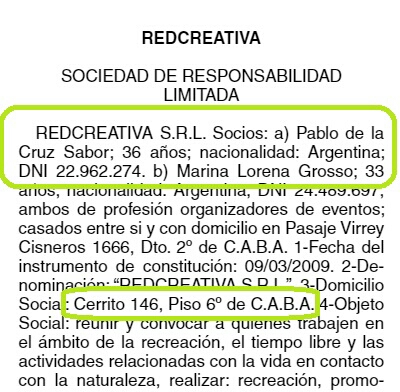 Red Creativa S.R.L. fue constituída en marzo de 2009 con el objeto de “reunir y convocar a quienes trabajen en el ámbito de la recreación, el tiempo libre y las actividades relacionadas con la vida en contacto con la naturaleza, realizar: recreación, promoción de derechos, juegos, campamentos, actividades, talleres, centros de recreación urbana, ayudar a la promoción y educación integrar de los derechos de los niños, adolescentes, jóvenes y adultos Guiarlos en el desarrollo de las propias capacidades y virtudes, al servicio de su vocación y para la construcción de su personalidad”. El domicilio social declarado será Cerrito 146, Piso 6º de la Ciudad Autónoma de Buenos Aires.