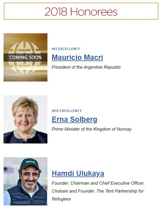 Junto con Macri han sigo galardonados este año Erna Solberg, Primer Ministro de Noruega y Hamdi Ulukaya, fundador, presidente y director ejecutivo de Chobani y fundador de Tent Partnership for Refugees.