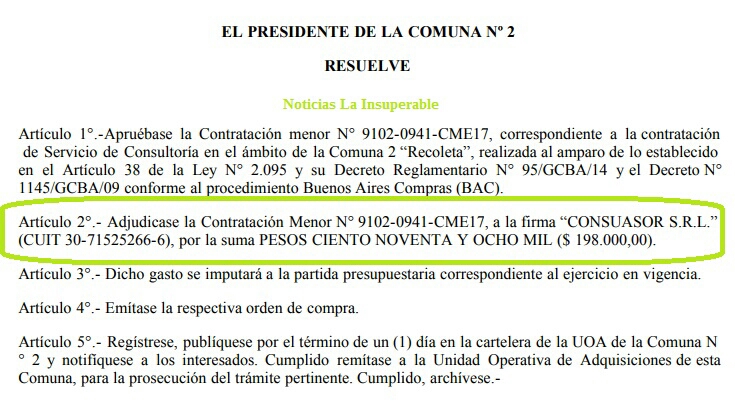 También el gobierno de Horacio Rodríguez Larreta a contratado los servicios de la consultora. En mayo del año pasado, a través de una “contratación menor” por el proceso de compra 9102-0941-CME17, la Comuna 2 de la Ciudad, a través de su presidente Agustín Fox, contrató a la misma por un Servicio de Consultoria por un monto de $198.000.-